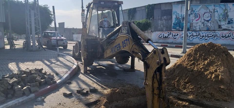 طاقم البلدية من قسم المياه والصرف الصحي يقوم بصيانة خط مياه في شارع صلاح الدين