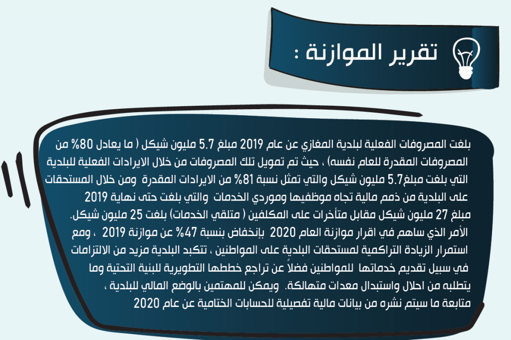 الخطة التنموية لبلدة المغازي للأعوام 2018-2021 هي خطة تمت بمشاركة المجتمع المحلي بصفته متلقي الخدمة، وهو الذي يتأثر ويؤثر بخدمات البلدية. تم إعداد الخطة من خلال الاستعانة بخبراء المجتمع المدني ومؤسساته العاملة في مخيم المغازي وبمشاركة موظفي وأعضاء المجلس بلدية المغازي، وذلك حسب الدليل المعد لها من خلال صندوق تطوير الهيئات المحلية الذي اوعز لجميع بلديات الوطن باعداد هذه الخطة... Read More