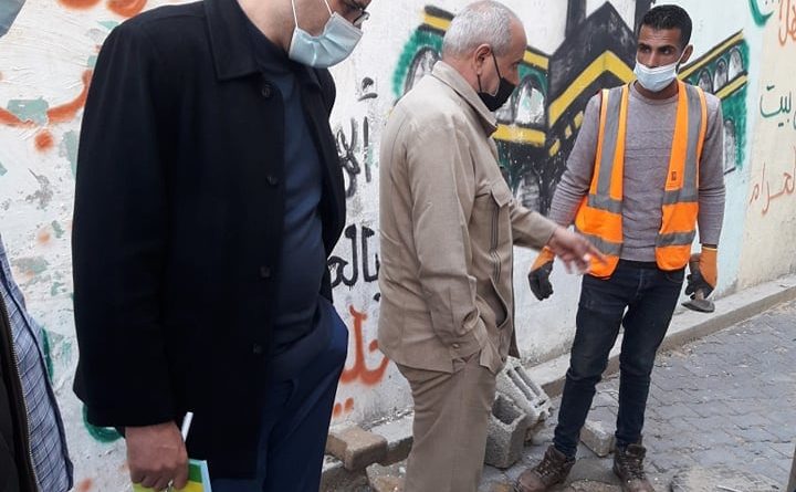 متابعة أعمال صيانة بلاط الشوارع الهابط في شوارع مختلفة من المخيم