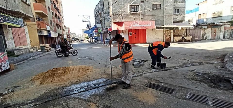 فرق الصيانة في بلدية المغازي تقوم بصيانة حفر في شوارع المخيم وإضافة خط صرف صحي