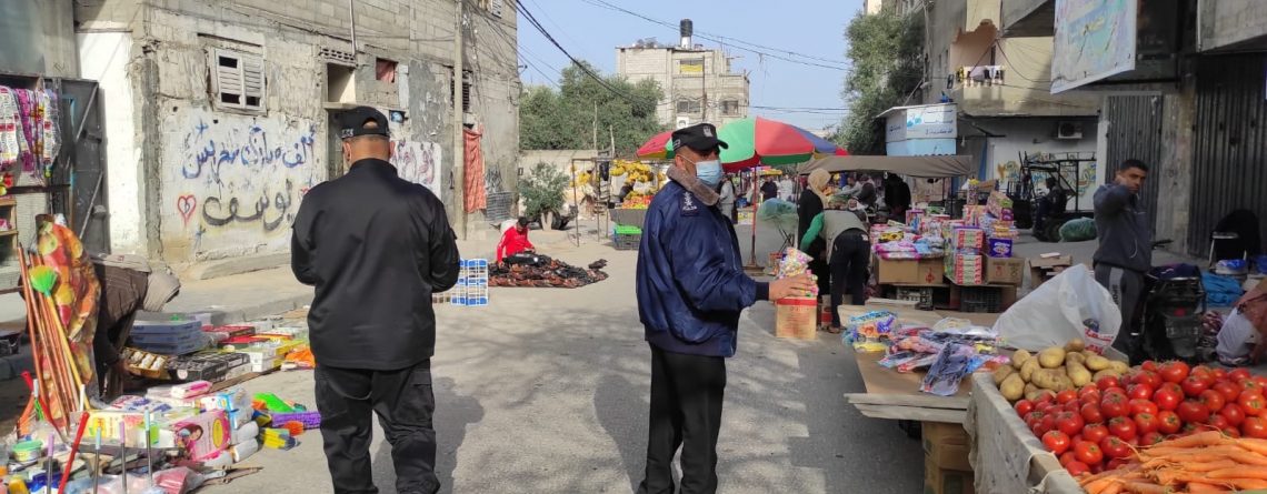 بلدية المغازي بالتعاون مع شرطة البلديات خلال تنظيم سوق الاحد الاسبوعي منعا للازحام واغلاق الشوارع، ولاتاحة الفرصة المتسوقين والباعة التحرك بحرية وسهولة.