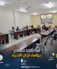 بلدية المغازي تلتقي برؤساء لجان الأحياء . . نظمت بلدية المغازي لقاء ضم رؤساء لجان الأحياء في المخيم لمناقشة أمور تهم المخيم وحضر اللقاء أ. حاتم الغمري رئيس البلدية، وأ. عبد الله الخواص عضو المجلس البلدي مسؤول ملف لجان الأحياء ، وعضو المجلس الأخ احمد أبو سعيد والاخ اديب أبو غزال مسؤول العلاقات العامة والإعلام في البلدية . وذلك بحضور كافة... Read More