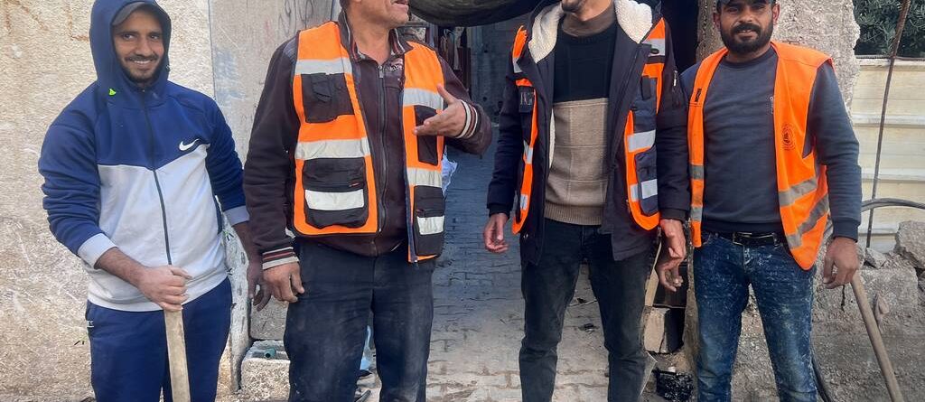 بلدية المغازي تواصل جهودها الميدانية لمواجهة آثار المنخفض الجوي في المخيم.